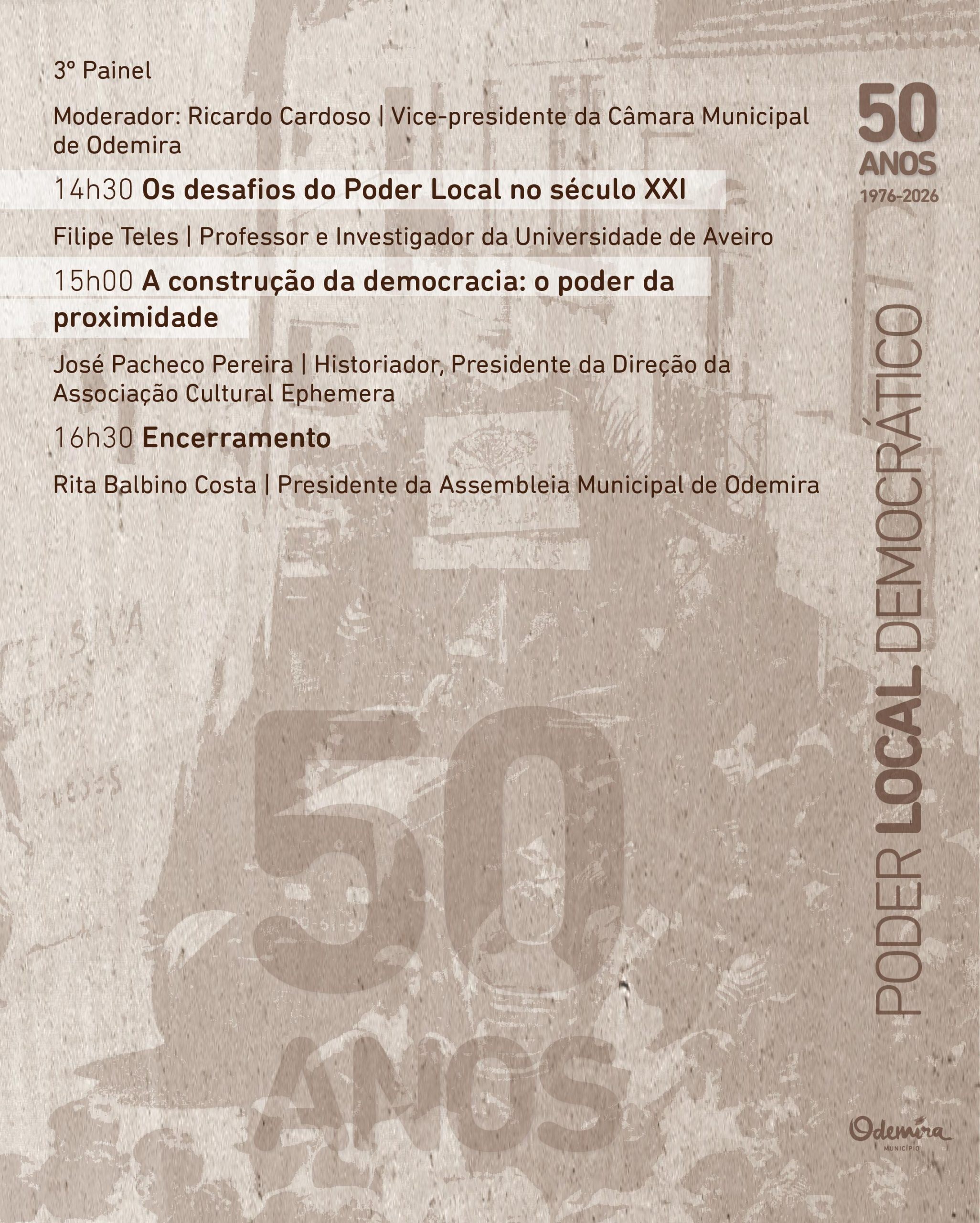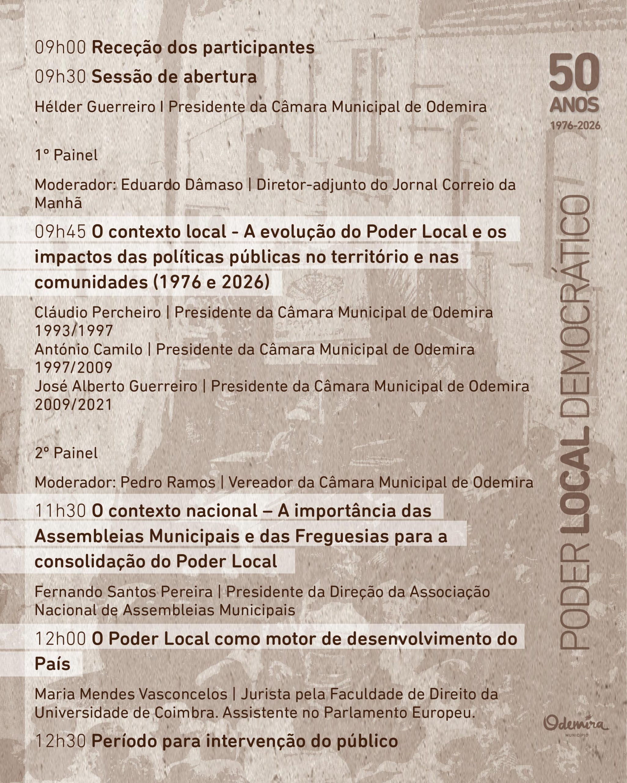 Consulte aqui o programa completo da conferência “50 Anos de Poder Local Democrático”, e inscreva-se até dia 20 de abril. A participação na conferência é livre e gratuita, mas implica a inscrição em: www.cm-odemira.pt/p/50anospoderlocal.